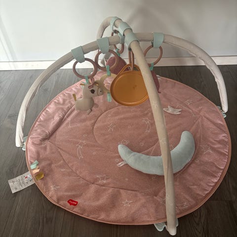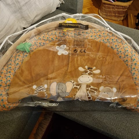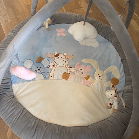 Jättefint babygym med 2 djur som är skallror och 2 moln som man kan trycka på som piper och molnet i mitten har en spegel (ett litet veck i spegeln, syns på bild)