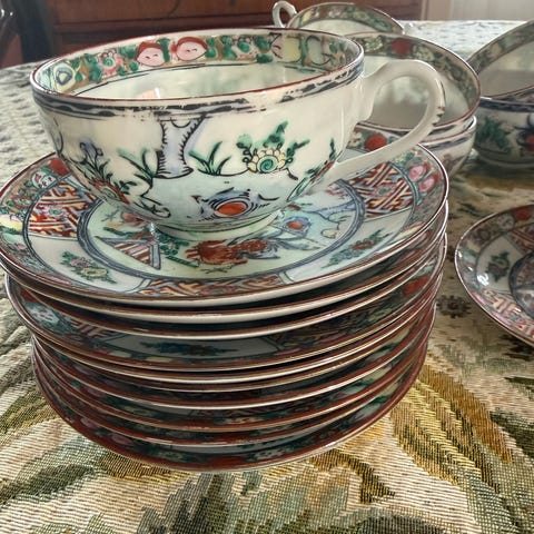 Set med 5 kaffekoppar med tillhörande fat i mycket tunn porslinskvalitet.