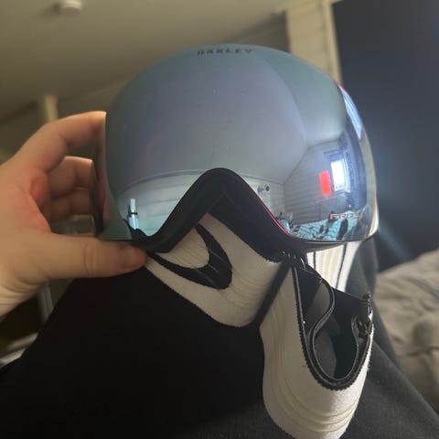 Oakley skidglasögon .Skidglasögonen har bred vit rem med glidskydd mot hjälmsidan ochOakley-logotyp och sfärisk lins. Dom har olika linsfärg vilket gör det möjligt att välja glasögonen efter olika ljusförhållanden vid skidåkning eller snowboardåkning.