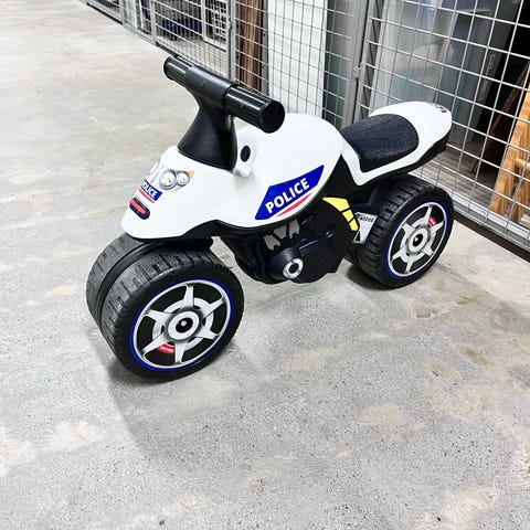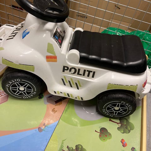 Politi gåbil i plast med vit kaross och svarta detaljer. Bilen har svart sits, svart ratt och fyra hjul med tryckt dekor. Lämplig som leksaksfordon för mindre barn att sitta på och ta sig fram genom att sparka med fötterna. Designad i polisbilsliknande utförande med texten "POLITI" och reflexliknande dekordetaljer på sidorna.