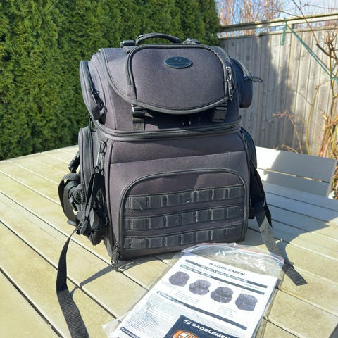 Motorcykelväska av typen Desperado från Saddlemen säljes. Extra toppväska följer med, lika så regnskydd, flera olika remmar och även remmar för att omvandla väskan till ryggsäck. Väldigt rymlig och enbart använd en gång.