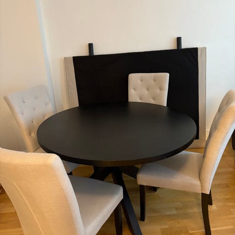 Bord 140 x 90 cm och 6 klädda stolar i grått tyg, från MIO-möbler, helt i nyskick, inga repor el dylikt.