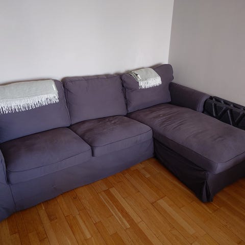 Bäddsoffa i bra skick, inga fläckar på den tvättbara och utbytbara klädseln. Plats för kuddar, täcke och madrass i schäslongen. Soffan är delvis demonterad för enklare transport.