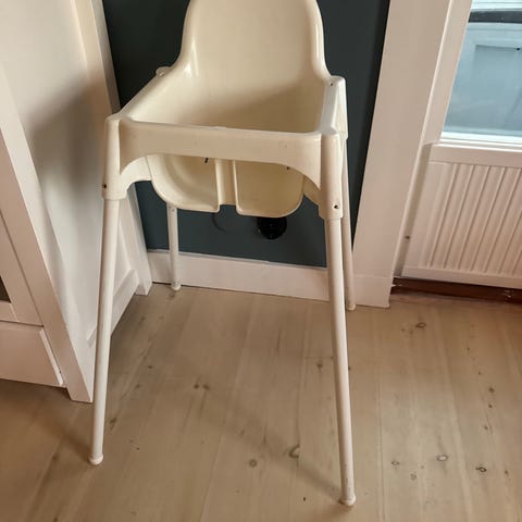 Ikea matstol för barn i vit plast med metallben. Stolen har inbyggd sittdel med bricka framtill som fungerar som bordsyta vid måltider. Passar för små barn som behöver sitta stadigt vid matbordet. Enkel, lätt att torka av och flytta mellan olika rum.