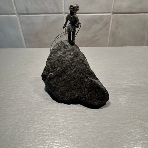 Henry Gustafsson Lyftet skulptur i sten och metall. Figuren föreställer en person som lyfter eller bär en större natursten, monterad på en sockel med texten "Lyftet". Skulpturen levereras med originalkartong märkt med konstnärens namn, småländske skulptören Henry Gustafsson. Passar som prydnad eller samlarföremål i hem- eller kontorsmiljö.