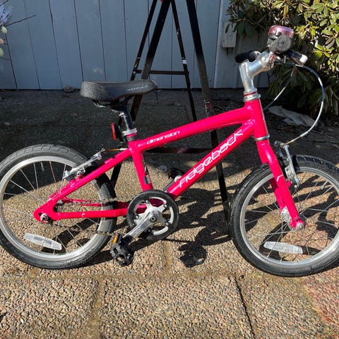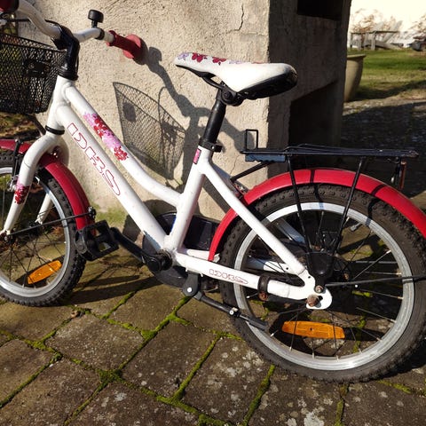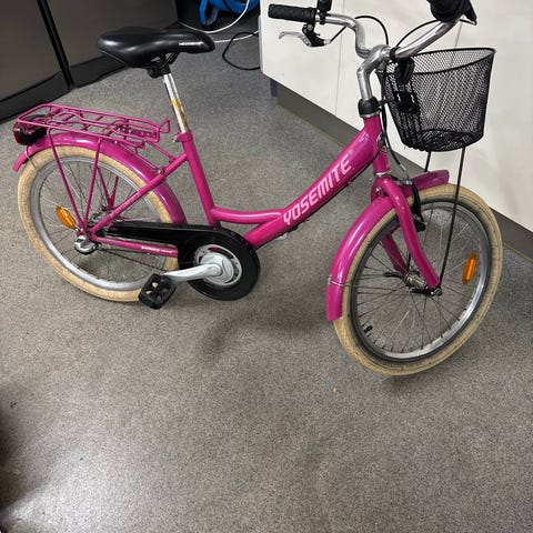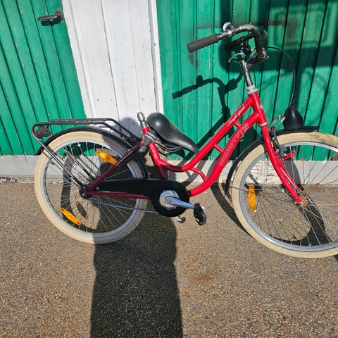 Barncykel med 20" hjul i röd färg. Cykeln har lågt insteg, pakethållare bak, stänkskärmar fram och bak samt kedjeskydd. Utrustad med upprätt styre och barnsadel. Lämplig för barn som passar storlek 20" hjul.