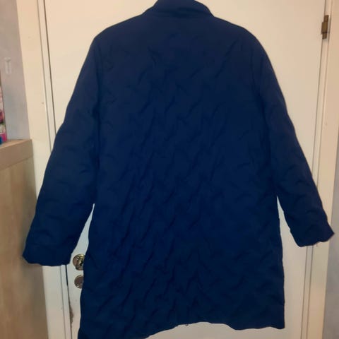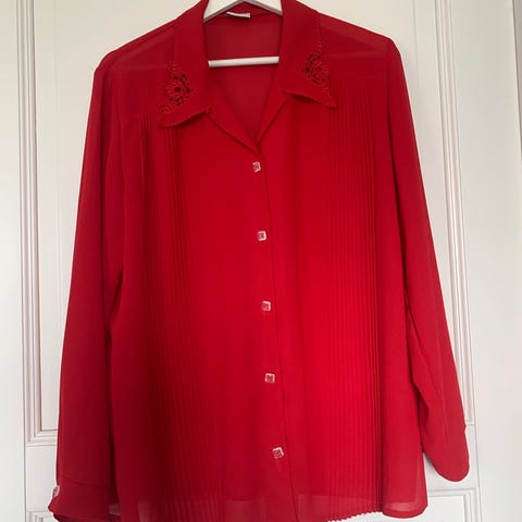 Skräddarsydd knytblus i strl. 50 i strykfritt material. Rynkad fram och bak samt vid ärmsluten. Knappar fram varav den sista är en omaka knapp. Sista fotot med den omaka knappen återger inte färgen på blusen på ett rättvist sätt.