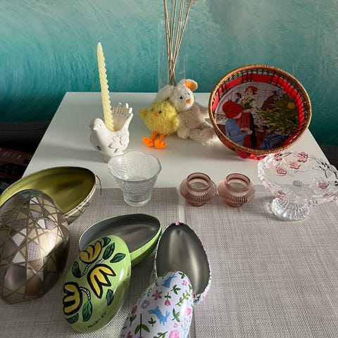 Större påskhöna av porslin, mindre kruka, litet påskägg av porslin, påskhöna i trä liknande material (delbar), en liten påskhare, en gul plåt kyckling, två tuppar att hänga i påskriset och tre magneter.