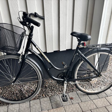 Monark dam/flickcykel med 26" hjul i svart färg 3 växlar . Utrustad med cykelkorg, pakethållare bak, stöd , ringklocka, lås med 2 nycklar, 3 växlar. Kvitto finns.