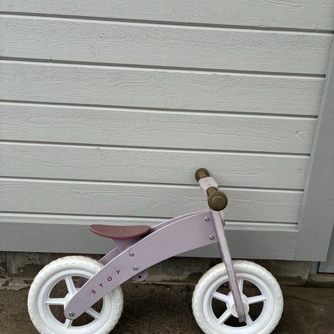 Balanscykel 12" rosa trä med vita hjul