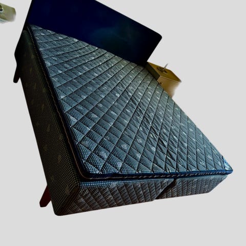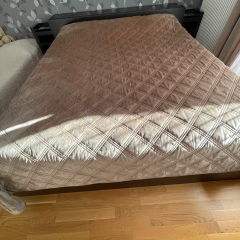 Dubbelsäng 180x200 cm, med 2 st tvättbar resårbotten 90x200 cm. Inkl 180x200 cm dreamzon madrass. Sängen har en grå stoppad sängram med hög gavl och ribbotten. Madrassen är vit med quiltat tvättbar överdrag. Passar som dubbelsäng i sovrum eller gästrum. Köptes totalt för cirka 8000 kr. Säljes för 2700 kr.