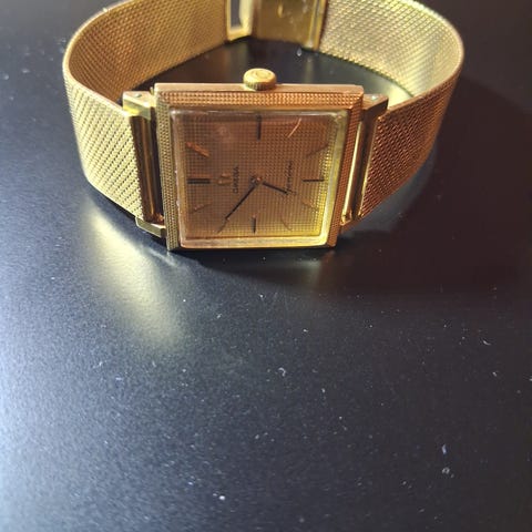 Omega herrklocka i 18 k guld, med rund boett och matchande urtavla. Klockan har datumvisning och guldarmband med viklås. Levereras i Omega-förpackning enligt bild. Passar för man. Vikt: 73.5 gram