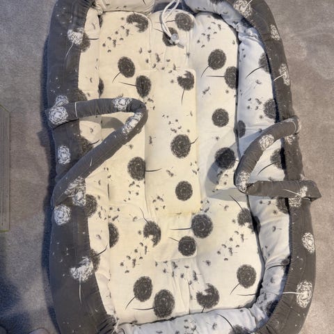 Säljer ett mjukt och bekvämt babynest i bomull, med två sidor (vändbart) – stjärnor på ena sidan och zigzag-mönster på den andra. Perfekt för nyfödda – ger en trygg och mysig sovplats. Avtagbar rosett ingår.