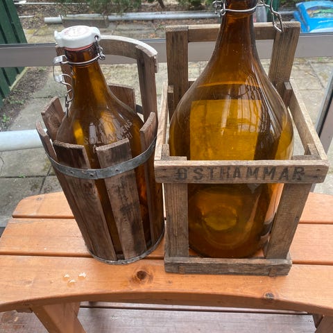 2 st gamla Svagdricksflaskor i glas med träställning.