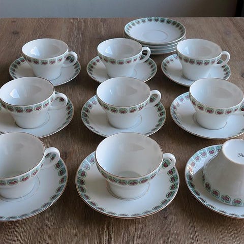 De är i blandat skick. Några har sprickor, några har gulnat i färgen, en har en liten flisa som gått bort och en hittar jag inget större fel på. Alla har krackeleringar i olika grad.