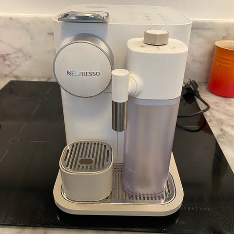 Nespresso kaffemaskin med mjölkskummare i svart utförande. Maskinen använder Nespresso-kapslar och har integrerad mjölkbehållare för tillredning av drycker med mjölk, till exempel cappuccino och latte. På ovansidan finns flera förvalda knappval för olika koppstorlekar och dryckesalternativ. Droppgaller och avtagbar vattenbehållare underlättar rengöring och påfyllning. Elanslutning med vanlig stickkontakt.