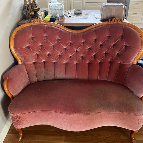 Nätt soffa som är ett smycke i sig. Tyget i sitsen är slitet men inte nedsutten.