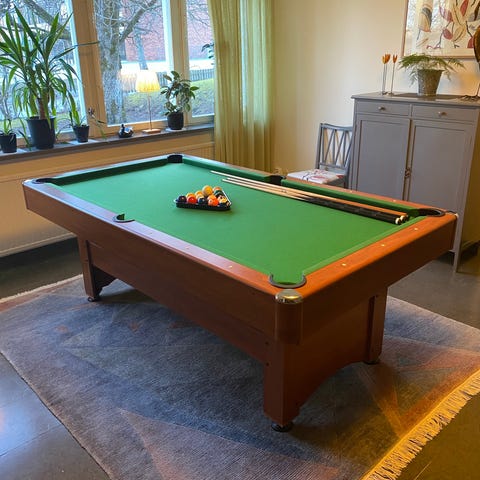 Biljardbord med grön spelyta. Till bordet hör köer, triangel och bollar enligt bild. Passar för hemmabruk och spel i mindre utrymmen, exempelvis barnrum eller spelrum.