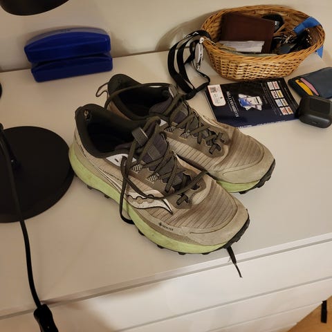 Jag säljer nu ett par träningsskor för herr i storlek 43. Skorna är beige med blå och röda detaljer samt snörning framtill. Yttermaterialet ser ut att vara mockaliknande textil med gummisula som har tydligt mönster för grepp vid vandring och promenader. Modellen är låg och lämpar sig för användning på varierat underlag vid fritidsaktiviteter och lättare vandring.