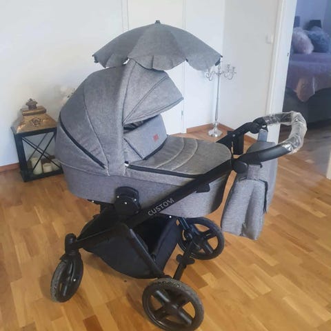 Det ingår sitt- och liggdel samt en matchande babyväska och till det regn- och nät till båda vagndelarna.