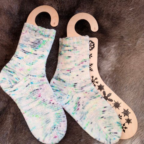 Stickade strumpor i flerfärgat handfärgat garn med blå, gröna och rosa nyanser. Kort skaft med resår upptill. Passar för vardagsbruk inomhus eller i skor.