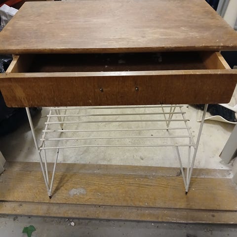 String vägghylla med låda formgiven av Nils Strinning. Hyllan består av en överdel i trä med integrerad låda och en underdel i vitlackerad metall med stång och stag som fungerar som tidnings- eller hatthylla. Monteras på vägg med skruvar genom metallstommen. Passar exempelvis i hall, sovrum eller vardagsrum för förvaring av mindre föremål och kläder eller tidningar.