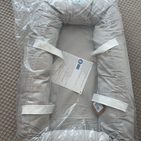 Babynest i grå färg. Mjukt, vadderat liggområde med upphöjda kanter runtom. Passar för spädbarn som viloplats i säng, soffa eller barnvagn. Mått 75 x 40 cm. Nytvättad I parfymfritt tvättmedel.
