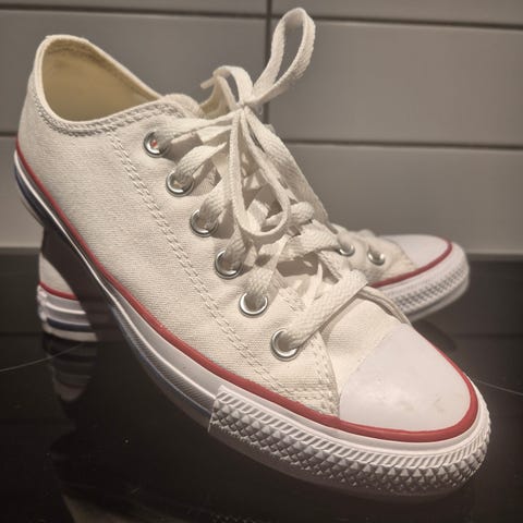 Converse sneakers i storlek 38. Skorna är låga med snörning och ovandel i röd canvas med vit tå och vit sula. Passar som vardagsskor eller fritidsskor. Unisexmodell.
