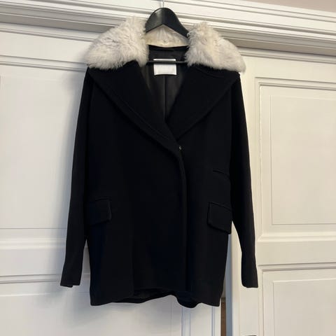 & Other Stories kappa för dam i storlek 38. Ytterplagg i svart färg, tillverkad i ull. Modellen har dubbelknäppning framtill och fickor nedtill. Stor krage i ljus, fluffig pälsimitation ger ett markerat uttryck. Passar som ytterplagg under kallare säsonger.