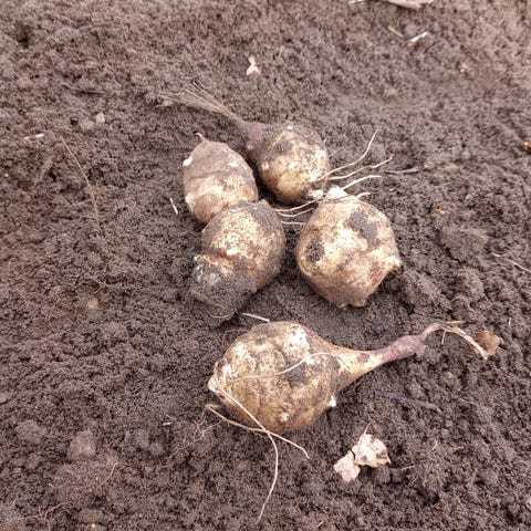 Finns såväl större för konsumtion samt mindre för utplantering. Vi gräver upp efterhand. Dels gula knölar som planteras nu och blommar i höst, även röda knölar som inte blommar i vårt klimat. Priset är per kg.