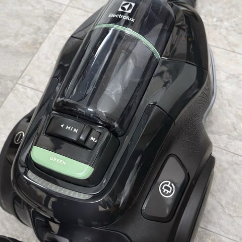 Electrolux med behållare ingen påsen dammsugare i blått och svart utförande. Modellen är en golvdammsugare med hjul och slang för torrdammsugning av golv och mattor i hemmet. Enheten har reglage på ovansidan för styrning och ett bärhandtag för enkel förflyttning. Passar för städning av hårda golv och textila ytor i hushållsmiljö.