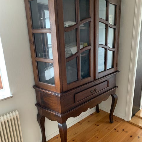 Antikt träskåp med glasdörrar och dekorativa sniderier. Skåpet har flera fack för förvaring och är utfört i mörkt trä. Det finns belysning i det stora skåpet..
