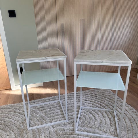 Säljer 2 stycken moderna sidobord i mycket fint skick – aldrig använda. Bordsskivor i härdat glas (tempered glass) – slitstarkt och säkert