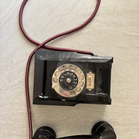 Antik äldre bordstelefon med mekanisk nummerskiva i beige plast. Luren ligger ovanpå telefonhuset och är ansluten med sladd. Telefonen har klassisk roterande nummerskiva med siffror 1–0 och metallisk fingerskiva. Passar som inredningsdetalj eller samlarobjekt. Vintage, välbevarad!