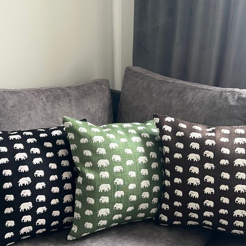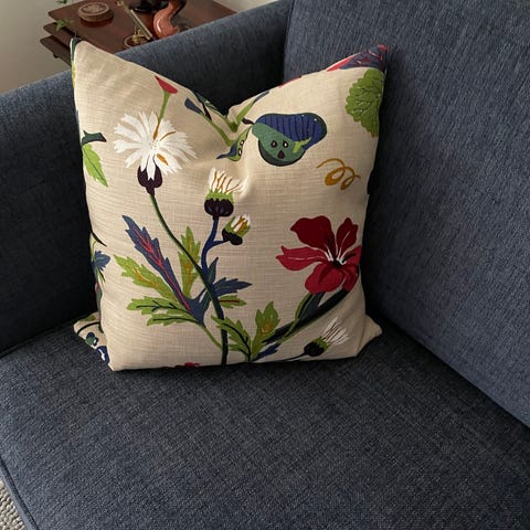 Tyget är ritad av GP & J Baker från svenskt tenn. Baksidan är i enfärgad matchande tyg. Kuddfodralen är hemsydda med överlock och har en dragkedja i botten.