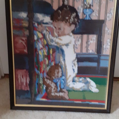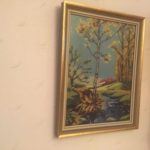 1st äldre inramad handgjord tavla i korsstygn med rådjursmotiv i skogsmiljö