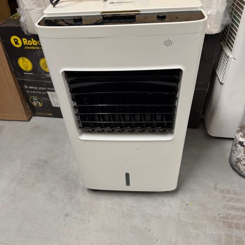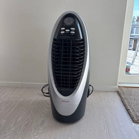 Honeywell CS10XE evaporativ luftkylare. Modellen är en bärbar luftkylare avsedd för inomhusbruk med en effekt på 100 W. Inställningar för kylfunktion, svängfunktion, timer och fläkthastighet. Utrustad med hjul för enkel förflyttning. (Nypris var 3100 SEK)