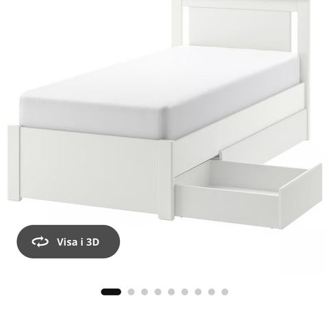 IKEA säng med förvaringslådor under, i vit färg. Enkelsäng med rak huvudgavel och två utdragbara lådor för förvaring av exempelvis sängkläder eller leksaker. Madrass och bäddmadrass på bilderna ingår.