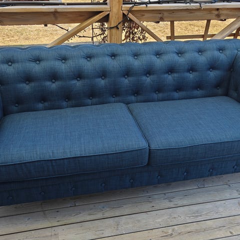 En av kuddorna har en lagning och det finns ett vist slitade på skinnet, famförallt ena armstödet.