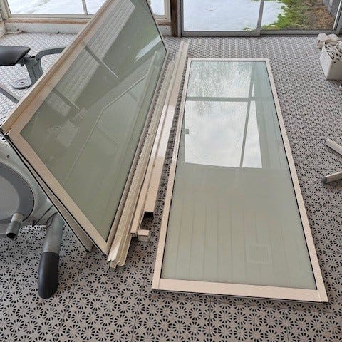 Inglasning 8m inkluderar: skjutparti 400cm/210cm och 2x fast sidofönster 200cm/210cm