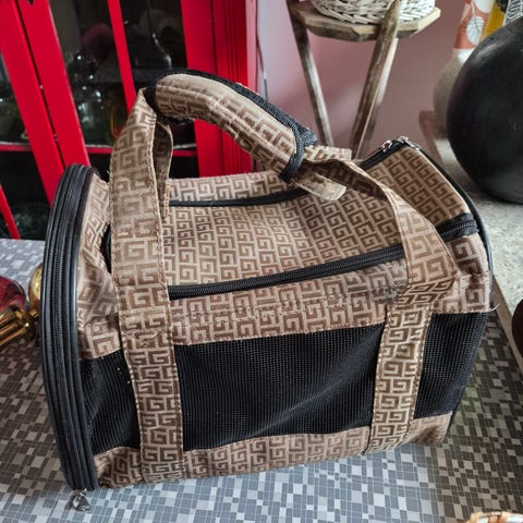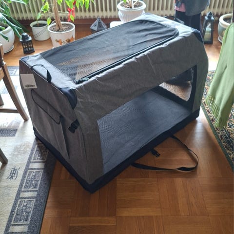 En stor trassportväska för katt eller mindre hund. Har haft båda mina katter i den samtidigt. Hopfällbar.