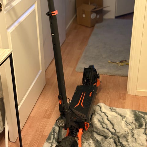 Kukirin elskoter i svart färg. Utrustad med digital display som visar hastighet och batterinivå. Elskotern har ståplatta med halkskydd och grovmönstrade däck anpassade för körning på hårda underlag. Medföljer gör manual och tillbehör enligt bild, bland annat fjärrkontroll och kablar. Lämplig för vuxen användare beroende på lokala regler och föreskrifter.