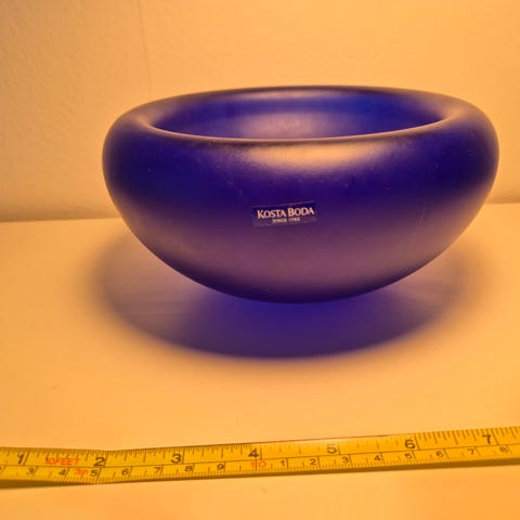 Kosta Boda skål i blått konstglas. Skålen har rund form med liten fot och tjockt glas. Insidan och utsidan är dekorerad i olika blå nyanser med inslag av andra färger. Passar som fruktskål, serveringsskål eller som dekorativ inredningsdetalj. Storlek 10 cm hög och 21 cm bred.