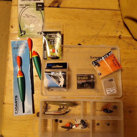 Blandat paket med fisketillbehör för mete/float fishing. Innehåller flera olika typer av flöten i olika storlekar och färger, bland annat modeller från Shakespeare,Premier,Classic och Darts AB. Det finns även små askar med sänken, tafsar, krokar på tafs, lösa krokar samt fiskelina. Delarna är sorterade i plastaskar och lämpar sig för mete och allroundfiske i sötvatten eller kustnära vatten. Fladen lådan ingår
