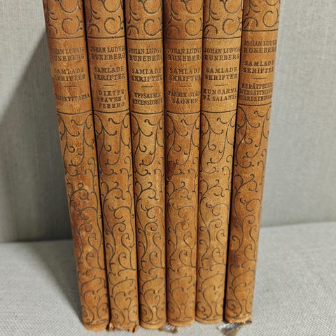 "Henrik den fjerdes ungdom" del 1 och 5. Böckerna är inbundna med röd dekorerad pärm och guldpräglad text på fram- och ryggsida. Utgivna 1888 resp 1889