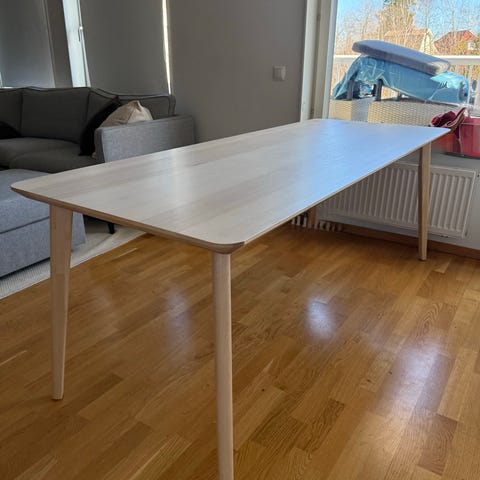 IKEA bord med design av Aage Petersen. Rektangulär bordsskiva i träutförande med synlig trästruktur och raka kanter. Underrede och ben i svart metall ger ett stabilt intryck och en tydlig kontrast mot bordsskivan. Passar som matbord, skrivbord eller arbetsbord i kök, vardagsrum eller arbetsrum. Bordet är fristående med fyra ben placerade i hörnen för god benutrymme under bordsskivan.