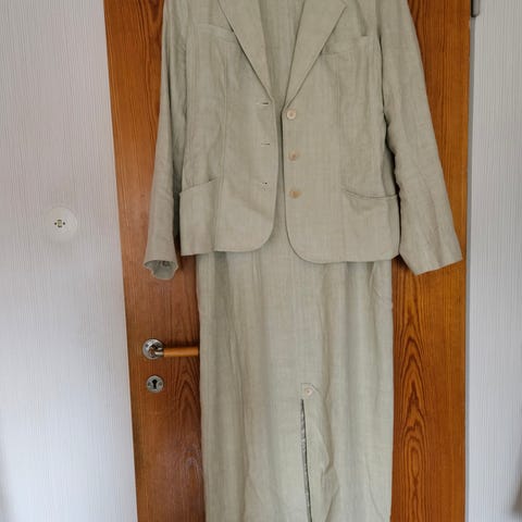 Setet består av en kavaj och en knälång kjol i brun polyester.