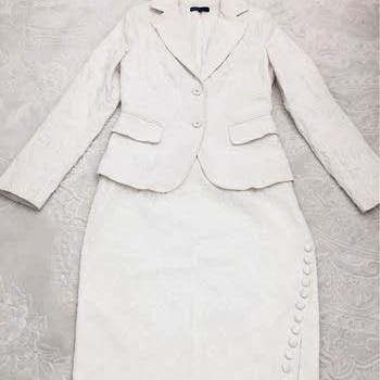 Kavajen har krage, knäppning fram, markerad midja med avtagbart bälte samt dekorativa knappar vid ärmsluten. Kjolen är rak i modellen med slits bak.