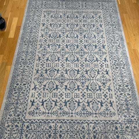 IKEA Vållöby matta i storlek 200x300 cm. Rektangulär, kortluggad matta med blommönster och bård i beige och blå toner.