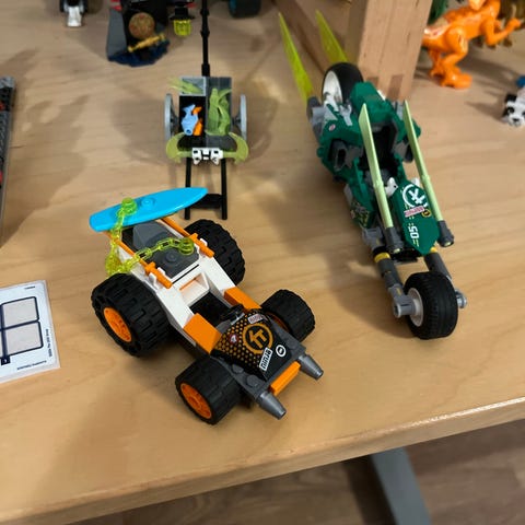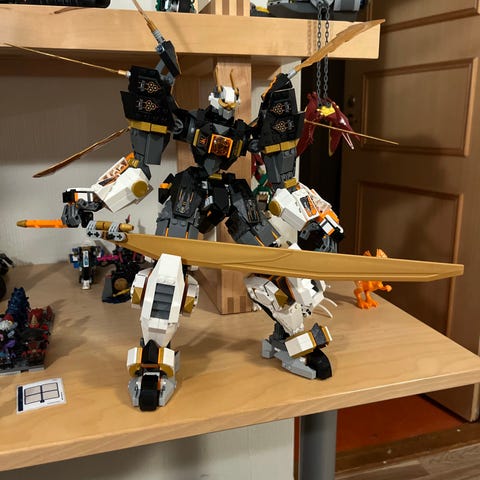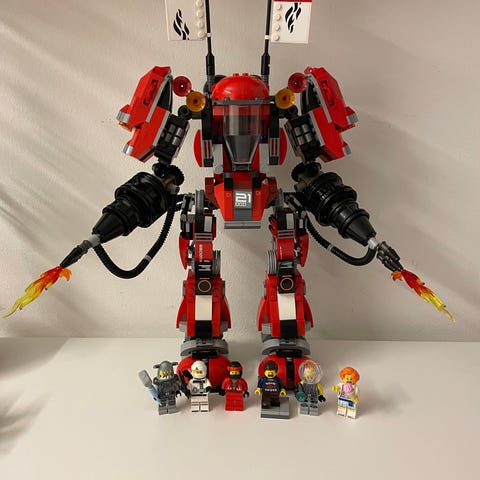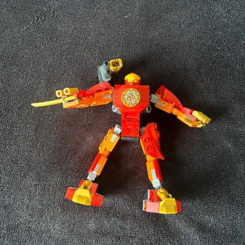 LEGO Ninjago robotfigur i röd och svart färg med gulddetaljer. Setet består av en byggbar robot/mech med rörliga leder, svärd och yxa samt en tillhörande röd Ninjago-minifigur med hjälm. Passar för lek och samlarbruk för den som gillar LEGO Ninjago och ninjateman. Exakt setnummer och antal delar är okänt.
